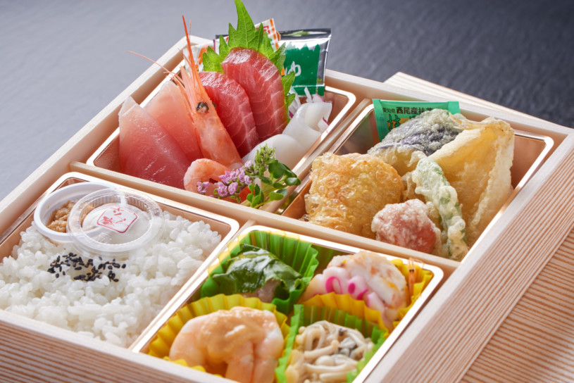 前菜、天ぷら盛、お刺身とバランスの取れた上品なお弁当です。