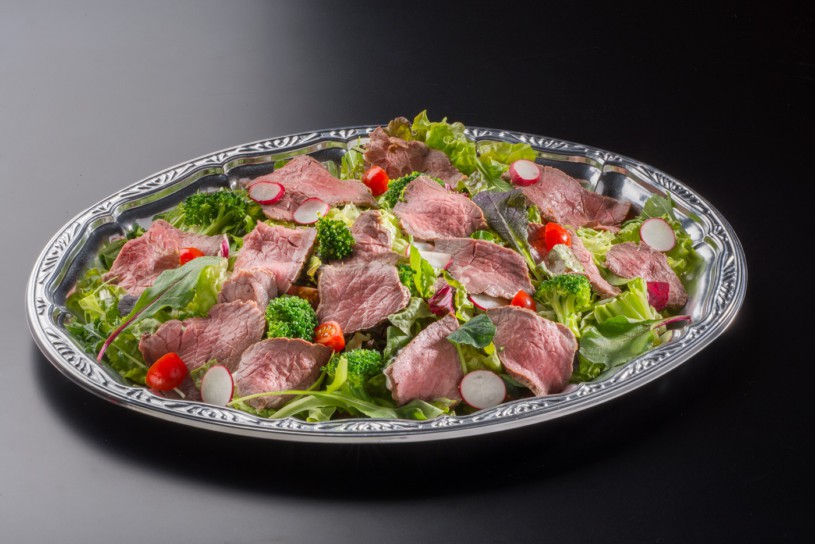 口の中で旨味が拡がる自家製ローストビーフと、10種類以上の新鮮野菜のサラダ。