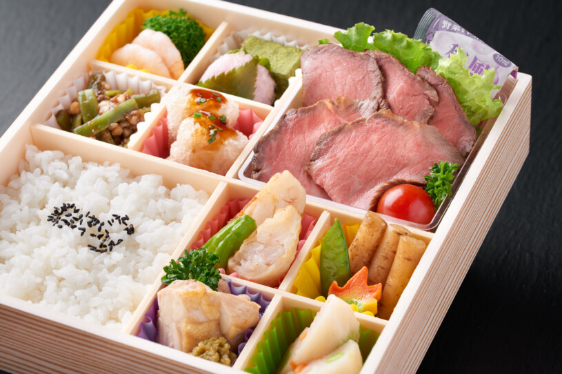 黒毛和牛のローストビーフ、小エビのサラダ仕立て、そばの実と山くらげの和え物、鱈甘酢あん、たたきごぼう、海老湯葉巻き、鶏塩焼き、枝豆しんじょう蒸し