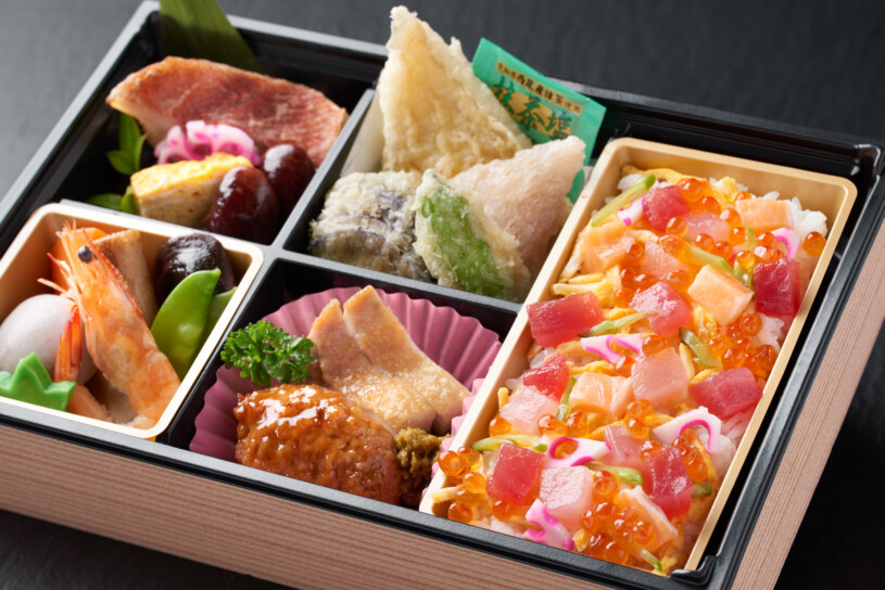 海鮮ばらちらし寿司、天ぷら、赤魚の西京焼き、有頭海老と野菜の炊き合わせ、鶏塩焼き柚子胡椒など
