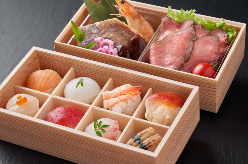 てまり寿司と天然真鯛、黒毛和牛の豪華なお弁当です。