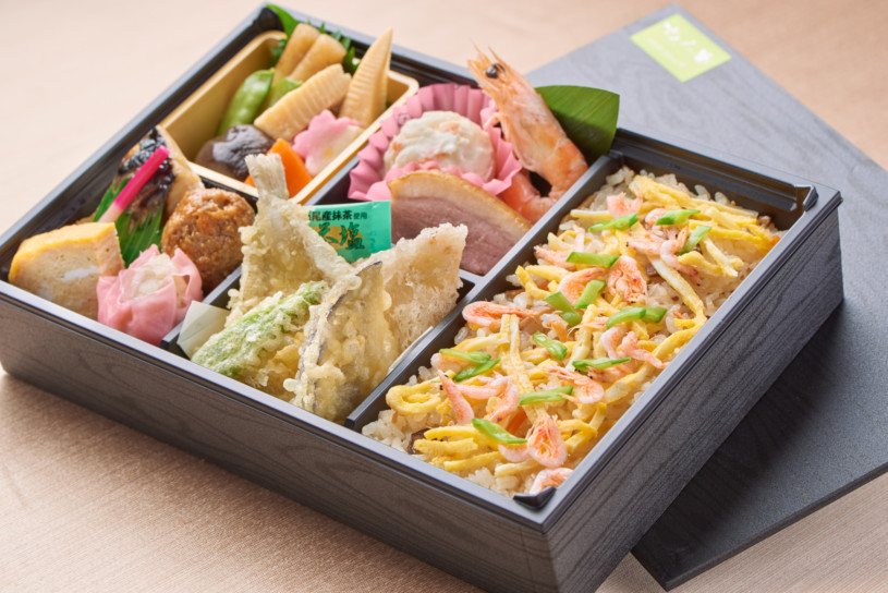 駿河湾産桜エビのちらし寿司/天ぷら盛/ポテトサラダ/合鴨ロースト/焼海老/筍しゅうまい/蒸し肉団子/玉子焼き/焼き魚