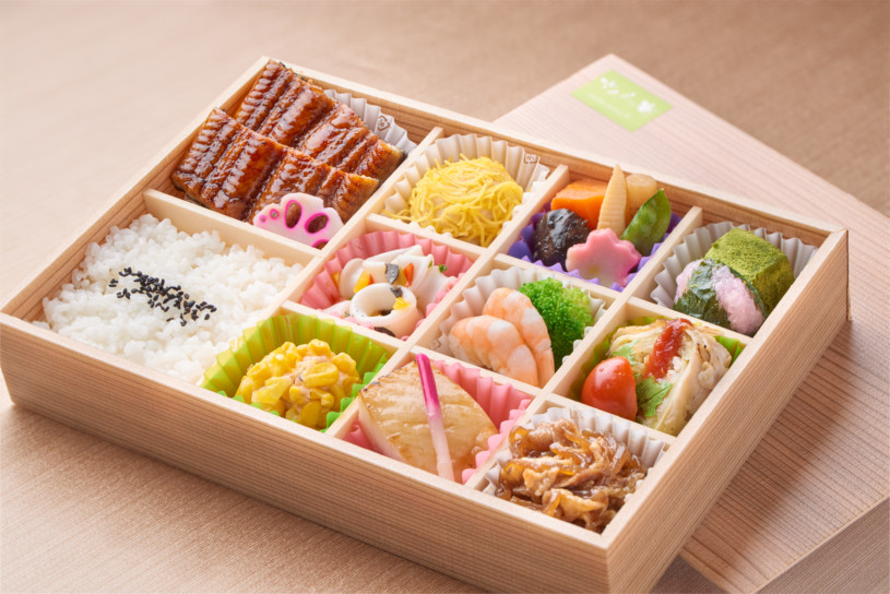 国産うなぎ蒲焼/カレイ照焼き/ロールキャベツ/コーン揚げ/イカのマリネ/牛すき煮/小エビカクテル/野菜炊き合せ/桜餅